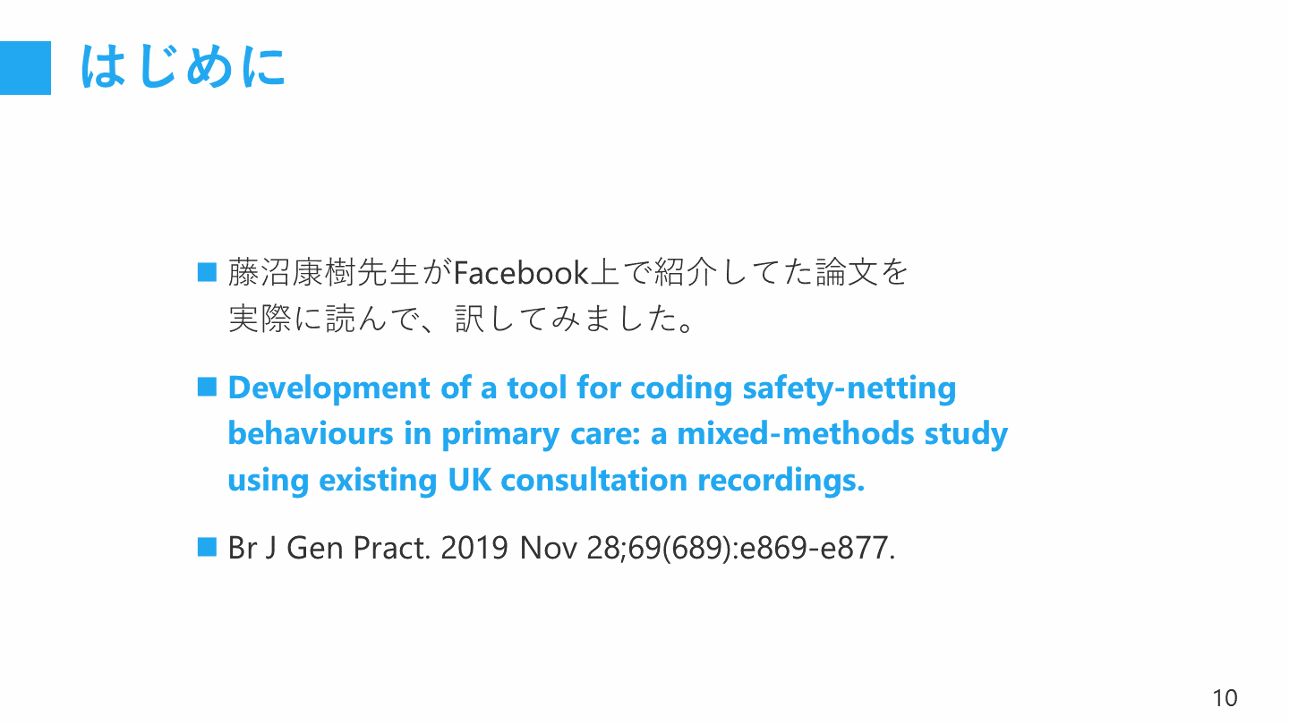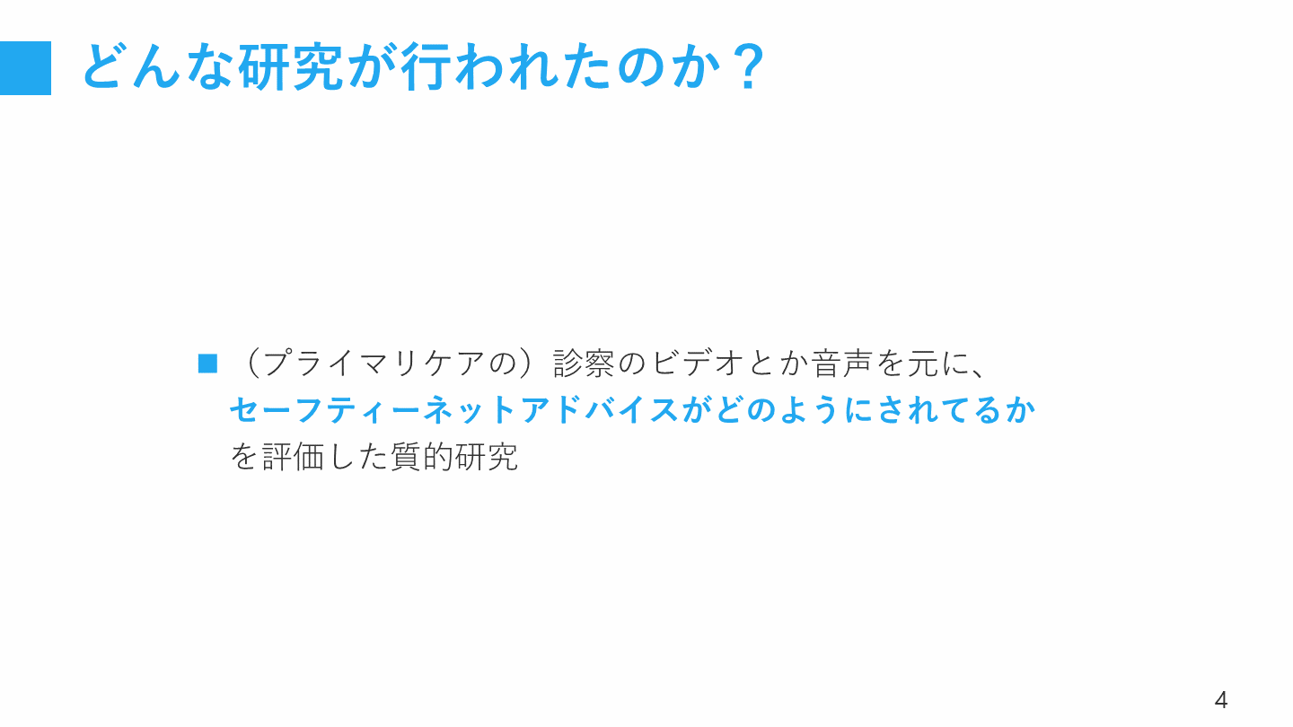 どんな研究が行われたのか? (プライマリケアの)診察のビデオとか音声を元に、セーフティーネットアドバイスがどのようにされてるかを評価した質的研究 #5.