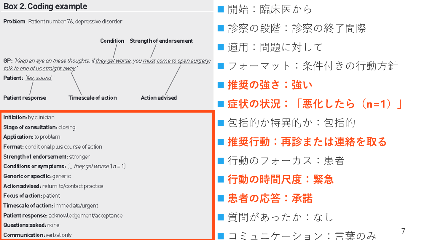 患者や住民(PPI)グループ PPIグループはコードをレビューし、更に2つのコードを開発した。①医師は患者がアドバイスを理解したかを確認したか?②患者はアドバイスに関して何らかの質問をしたか?