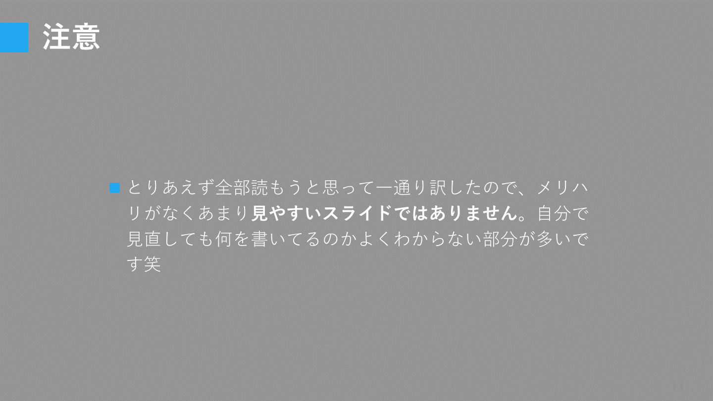 いまいちニュアンスがわからない言葉も多く、訳しづらいところはスライドには載せなかった。