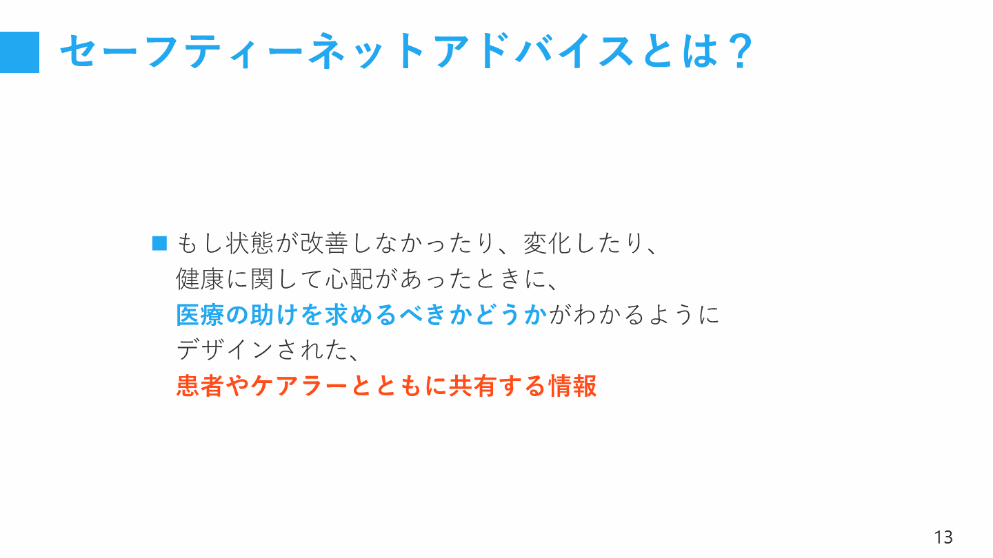 セーフティーネットアドバイスとは? もし状態が改善しなかったり、変化したり、健康に関して心配があったときに、医療の助けを求めるべきかどうかがわかるようにデザインされた、患者やケアラーとともに共有する情報 #14.