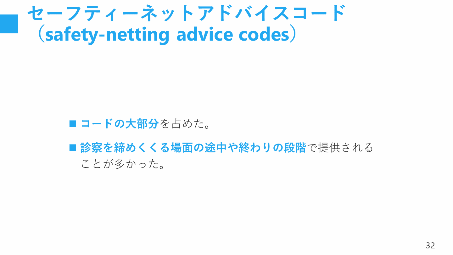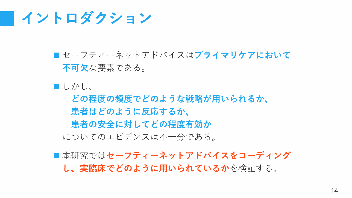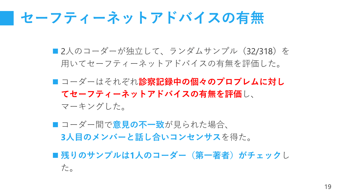 本研究ではセーフティーネットアドバイスをコーディングし、実臨床でどのように用いられているかを検証する。 データ収集とコーディング手法の詳細 #16.