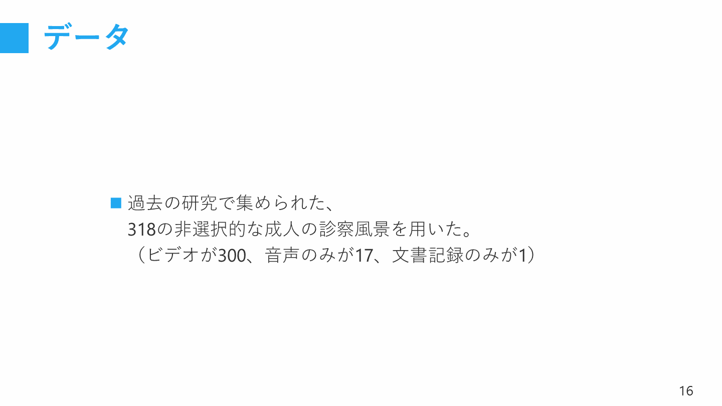 データ 過去の研究で集められた、318の非選択的な成人の診察風景を用いた。(ビデオが300、音声のみが17、文書記録のみが1) #17.