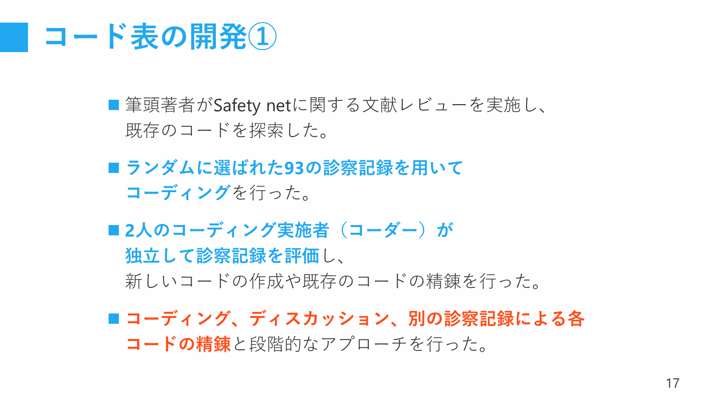 コーディング、ディスカッション、別の診察記録による各コードの精錬と段階的なアプローチを行った。 #18.