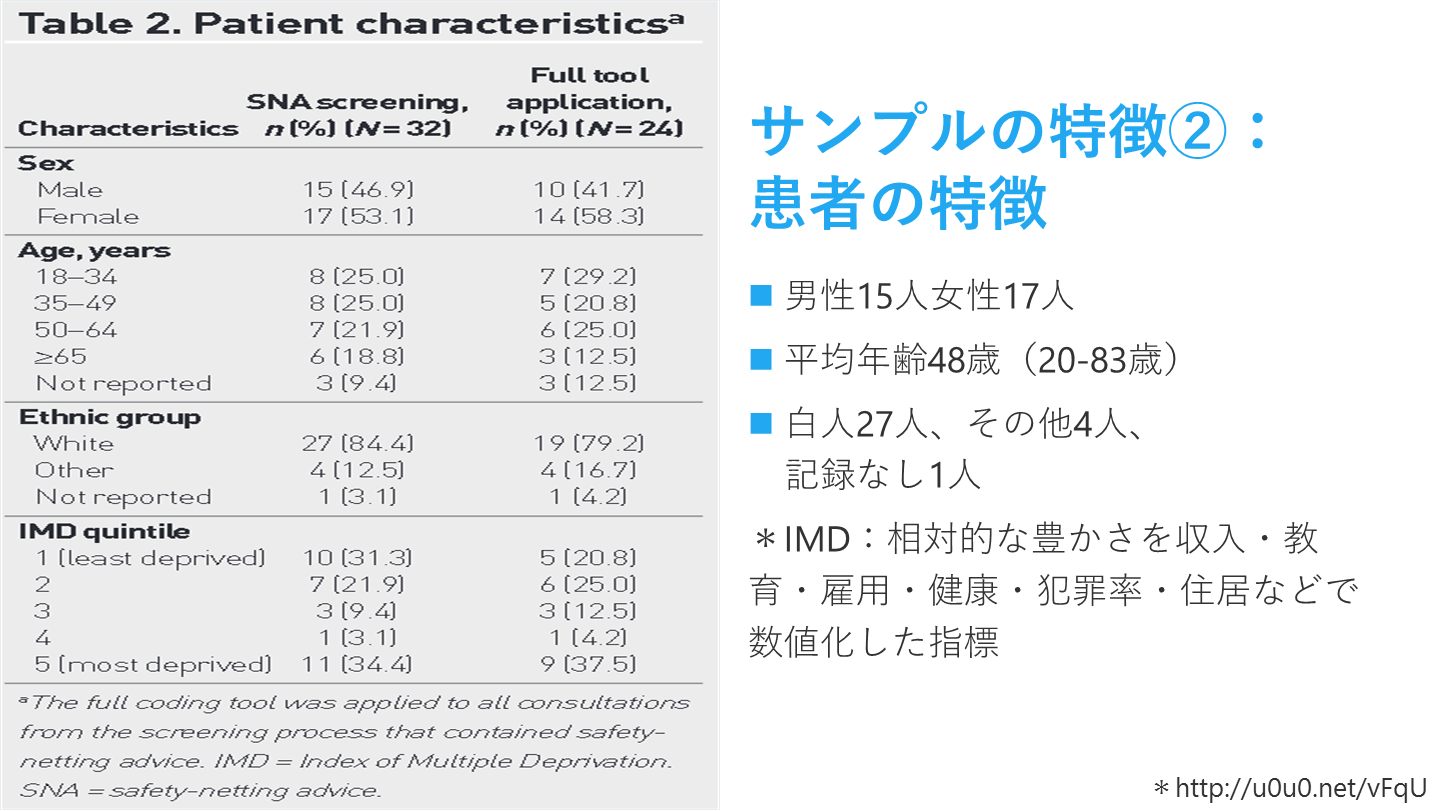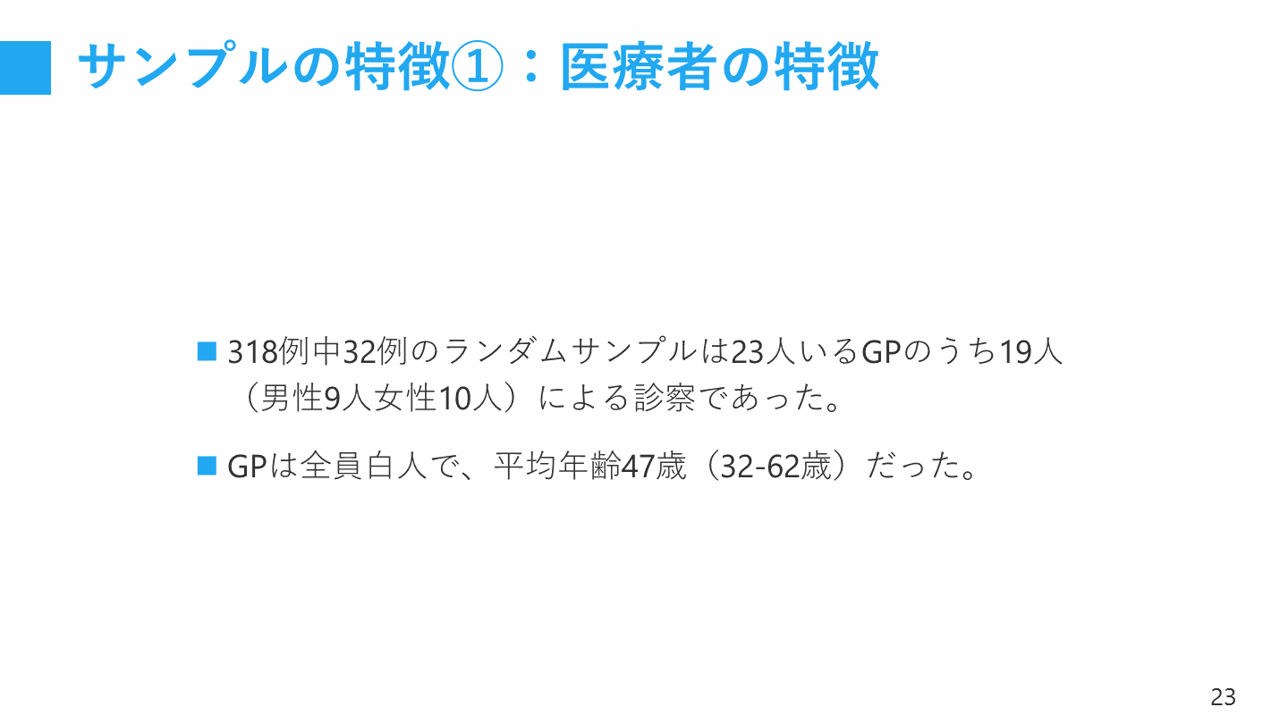 サンプルの特徴①:医療者の特徴 318例中32例のランダムサンプルは23人いるGPのうち19人(男性9人女性10人)による診察であった。
