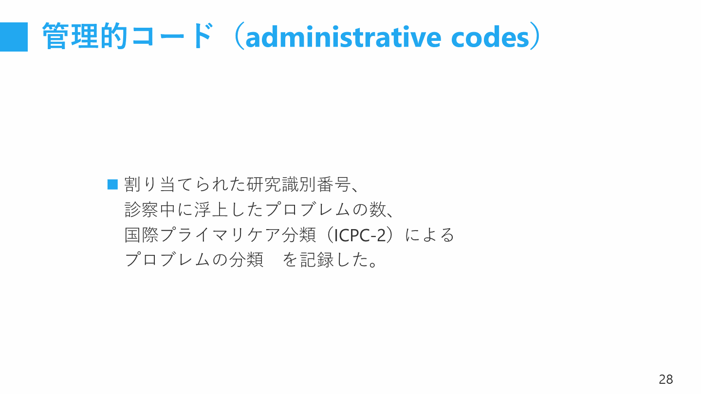 管理的コード(administrative codes) 割り当てられた研究識別番号、診察中に浮上したプロブレムの数、国際プライマリケア分類(ICPC-2)によるプロブレムの分類 を記録した。 #29.