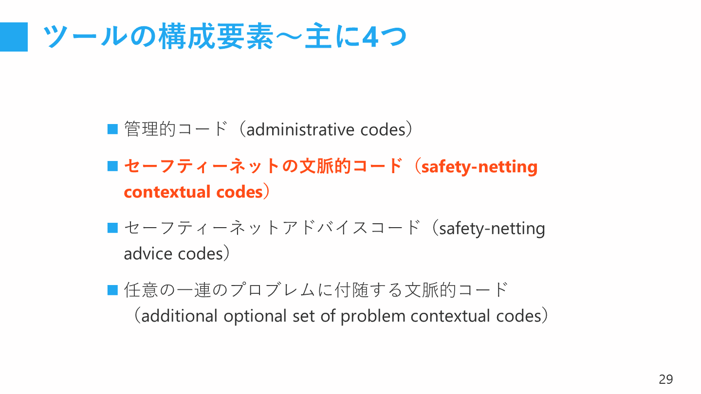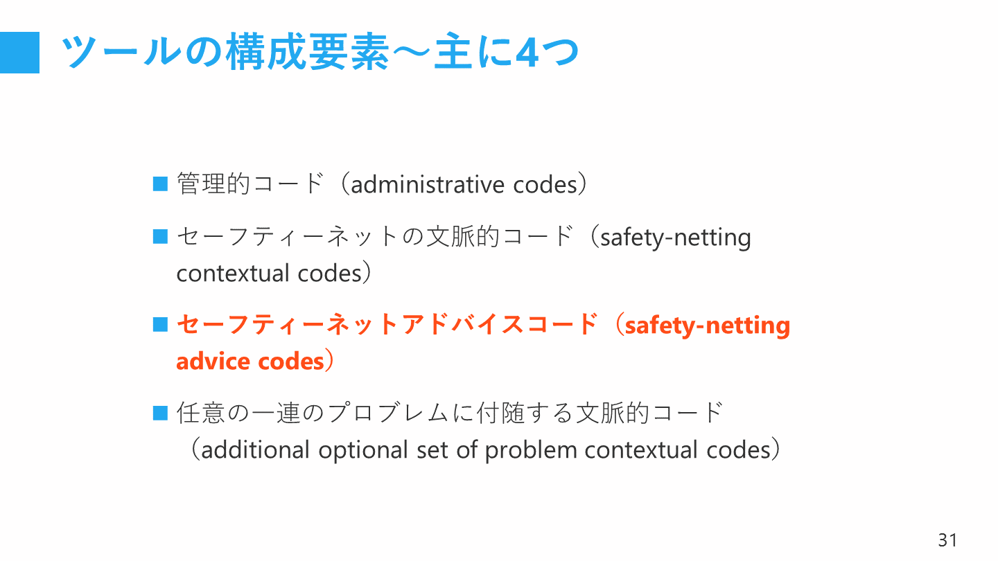 任意の一連のプロブレムに付随する文脈的コード(additional optional set of problem contextual codes) どのようなプロブレムがあるとセーフティーネットアドバイスが出現しやすいかを同定するのに役立つコード。