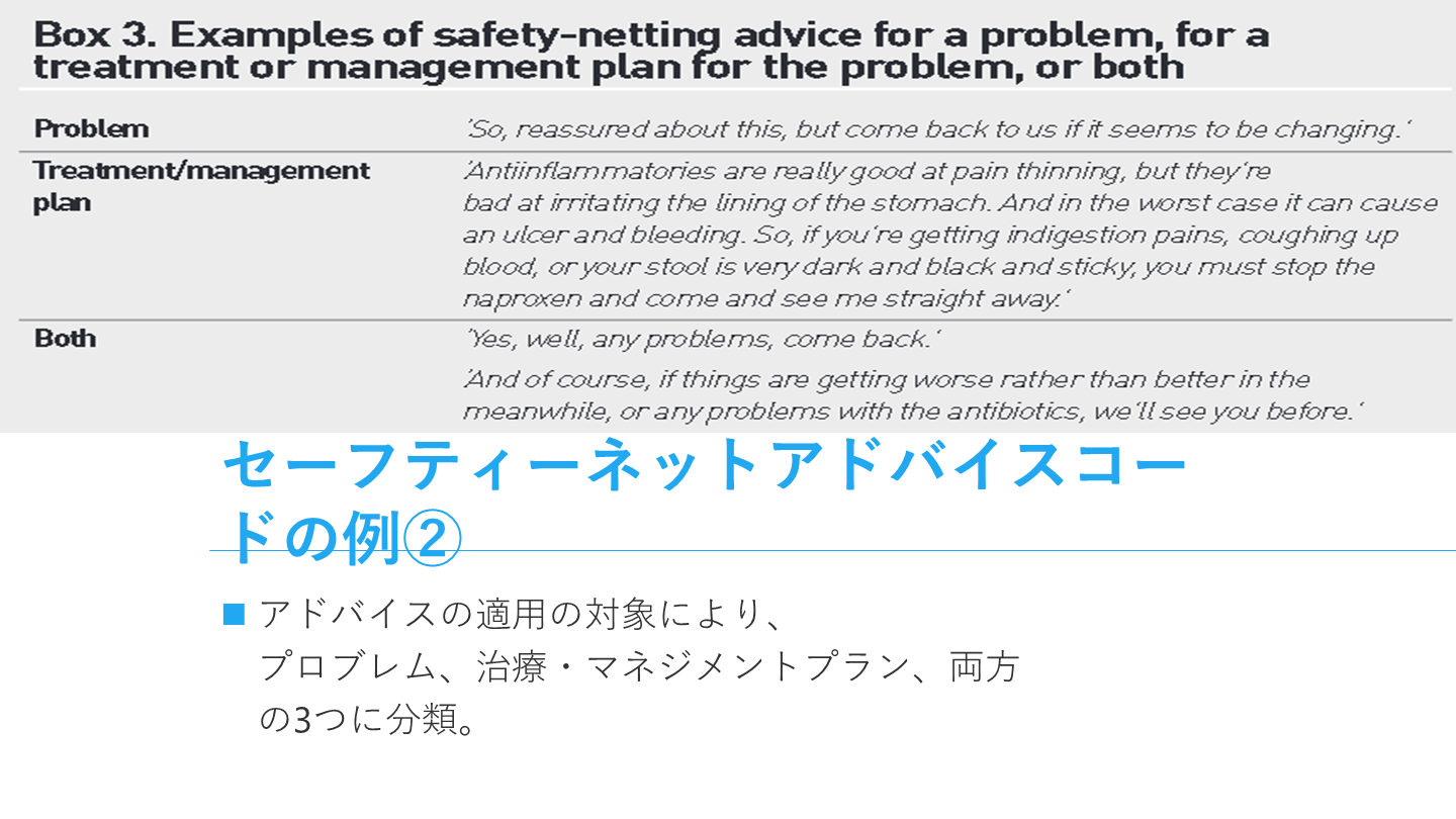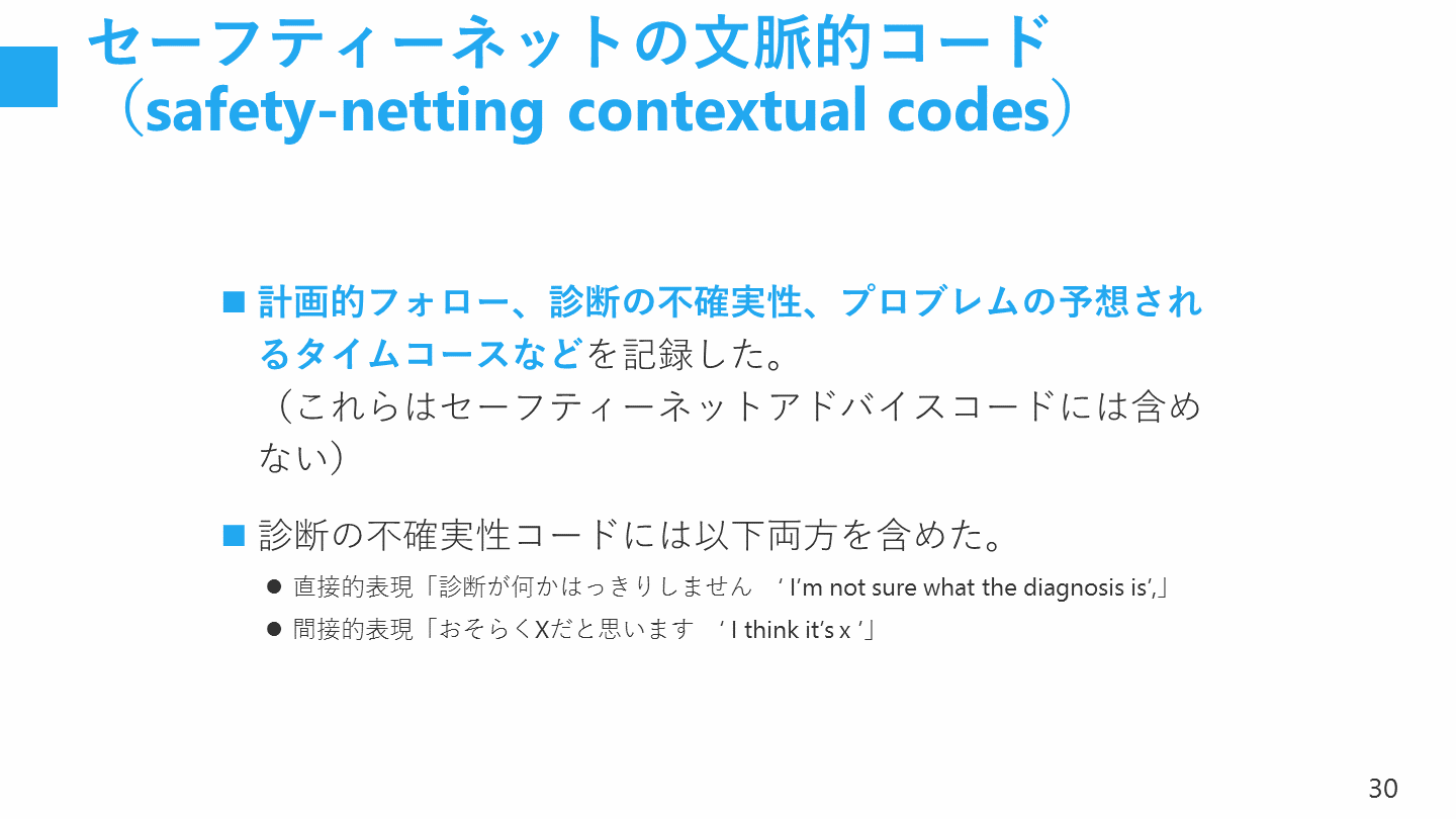 セーフティーネットの文脈的コード(safety-netting contextual codes) 計画的フォロー、診断の不確実性、プロブレムの予想されるタイムコースなどを記録した。(これらはセーフティーネットアドバイスコードには含めない)