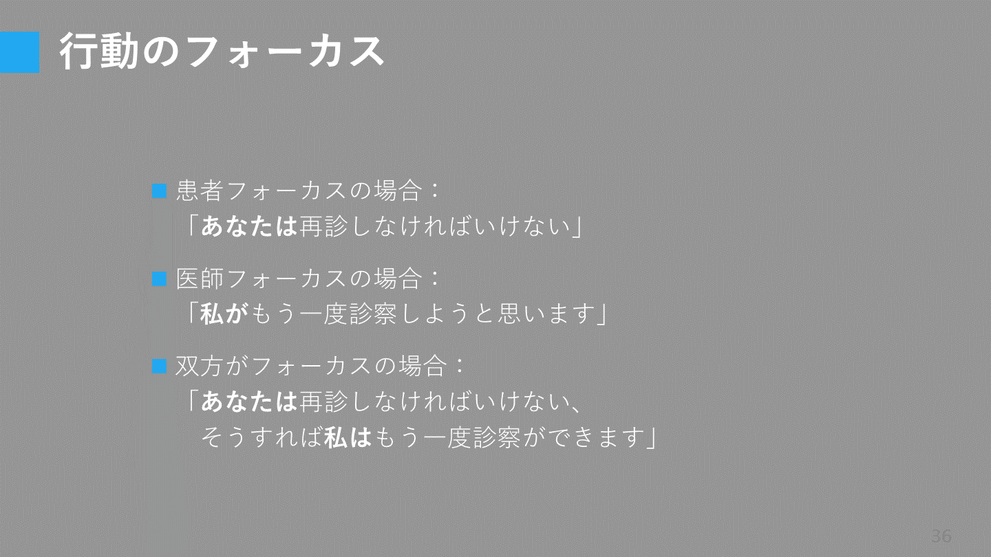 行動のフォーカス 患者フォーカスの場合:「あなたは再診しなければいけない」