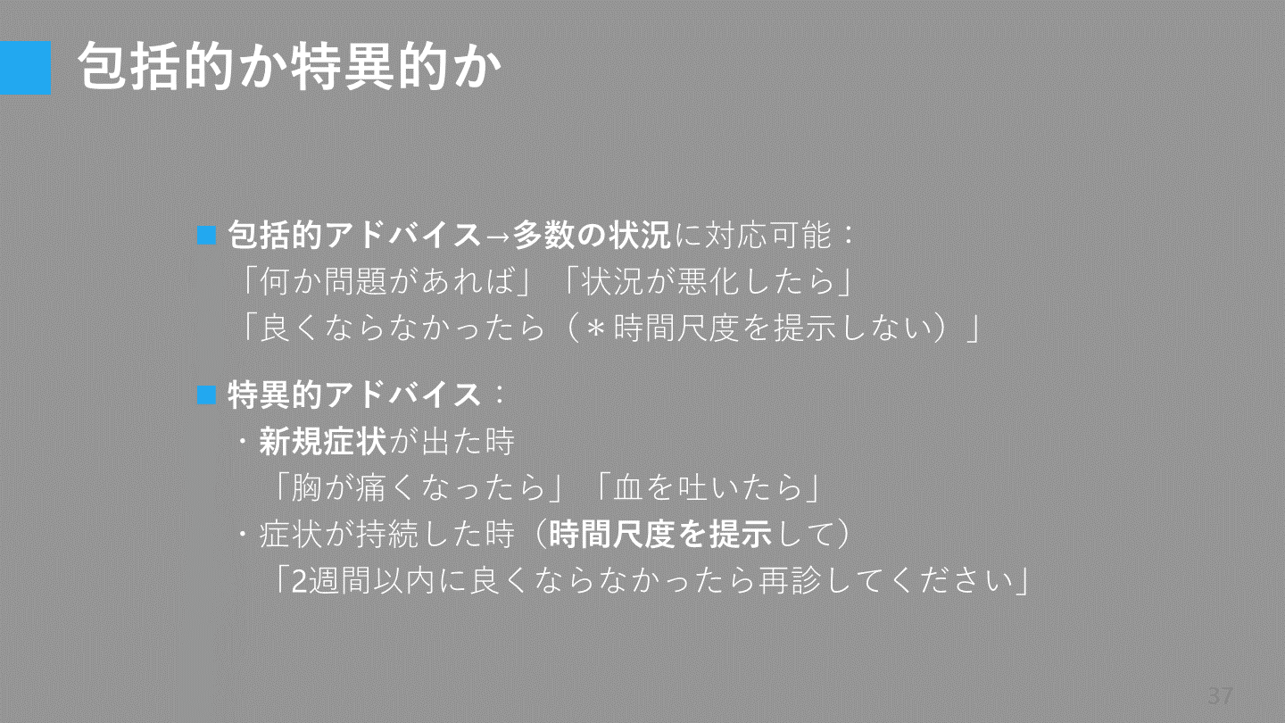 包括的か特異的か 包括的アドバイス→多数の状況に対応可能:「何か問題があれば」「状況が悪化したら」「良くならなかったら(*時間尺度を提示しない)」