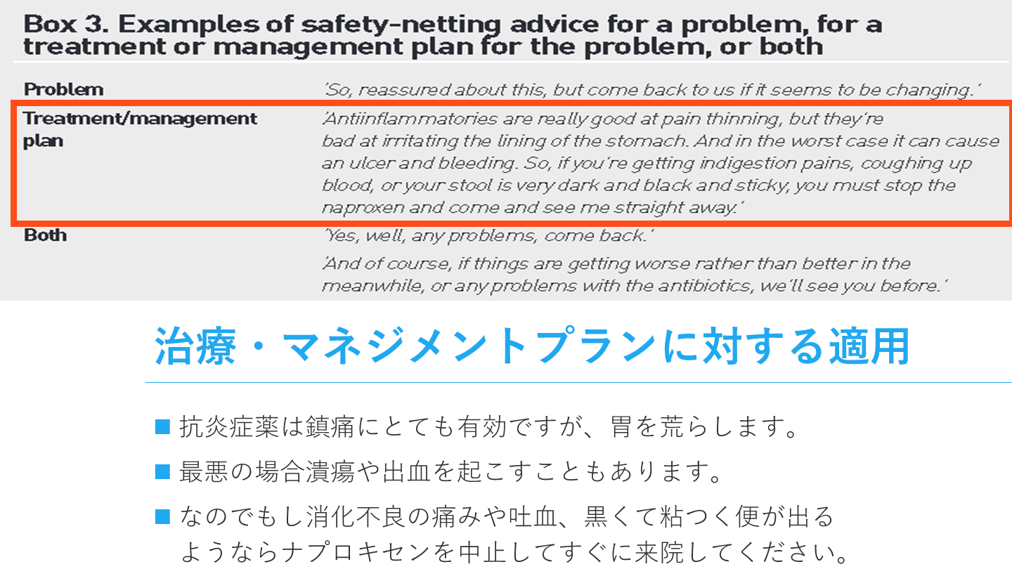 なのでもし消化不良の痛みや吐血、黒くて粘つく便が出るようならナプロキセンを中止してすぐに来院してください。 治療・マネジメントプランに対する適用 #41.