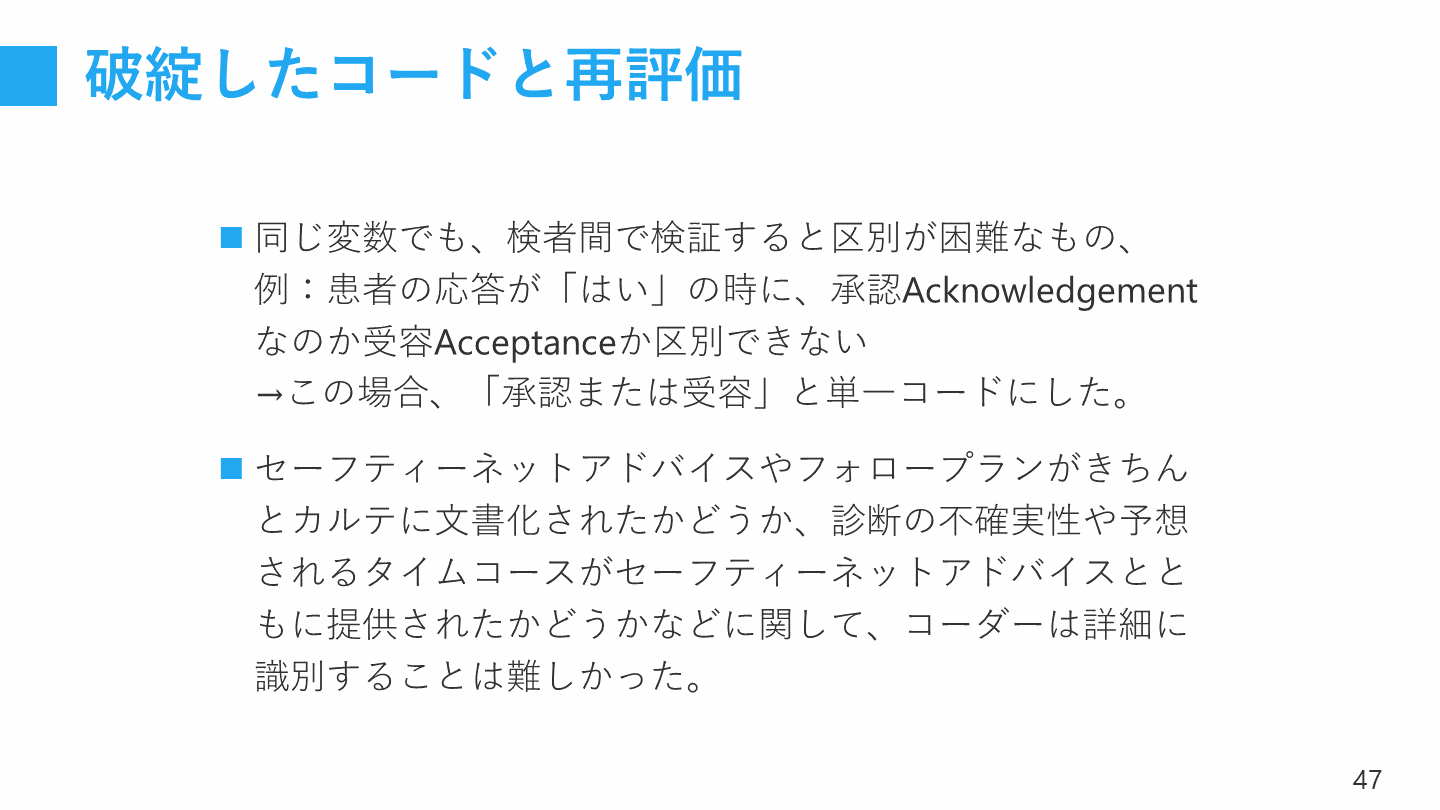 破綻したコードと再評価 同じ変数でも、検者間で検証すると区別が困難なもの、例:患者の応答が「はい」の時に、承認Acknowledgementなのか受容Acceptanceか区別できない→この場合、「承認または受容」と単一コードにした。