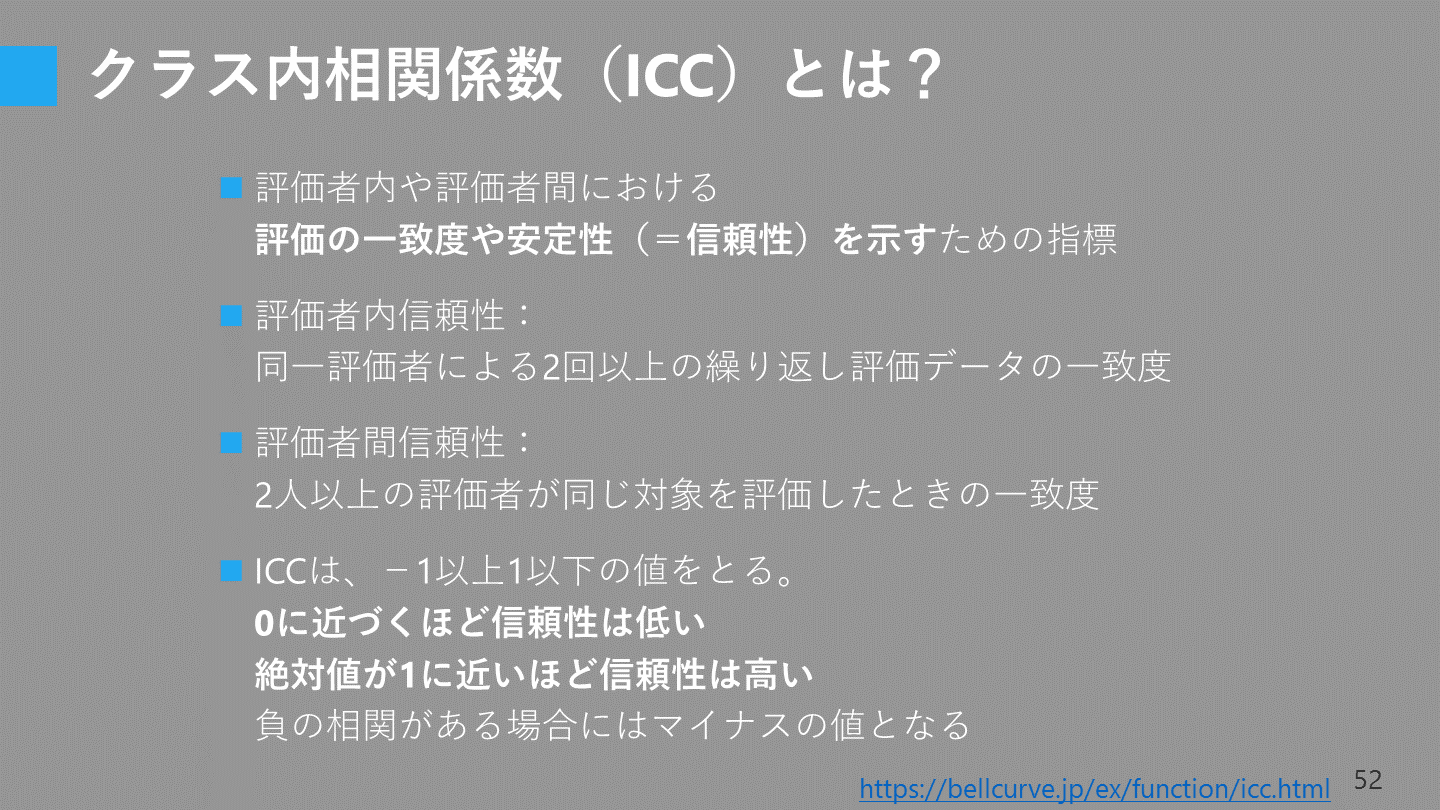 ICCは、-1以上1以下の値をとる。0に近づくほど信頼性は低い絶対値が1に近いほど信頼性は高い負の相関がある場合にはマイナスの値となる https://bellcurve.jp/ex/function/icc.html #54.