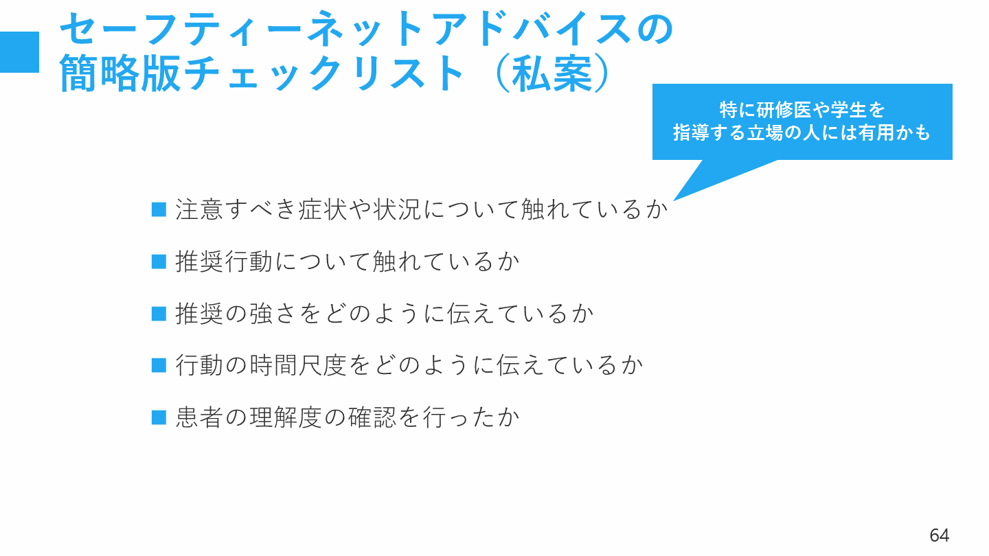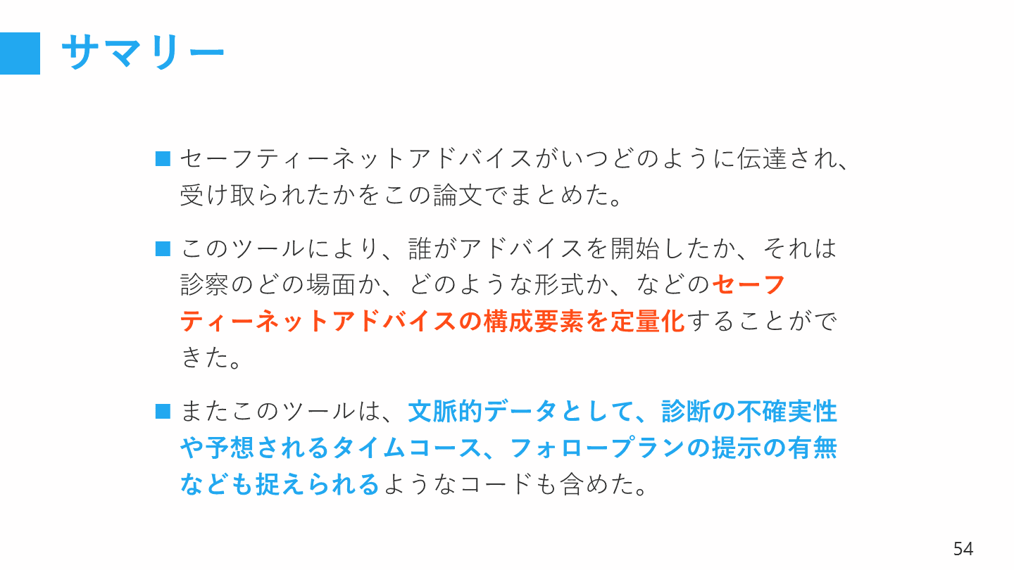 まとめると、セーフティーネットアドバイスを体系的に評価できるツールを開発したが、患者の理解度の評価や、アドバイスが臨床アウトカムにどう影響するかに関しては更なる研究が必要である。 実臨床での応用と今後の展望 #63.