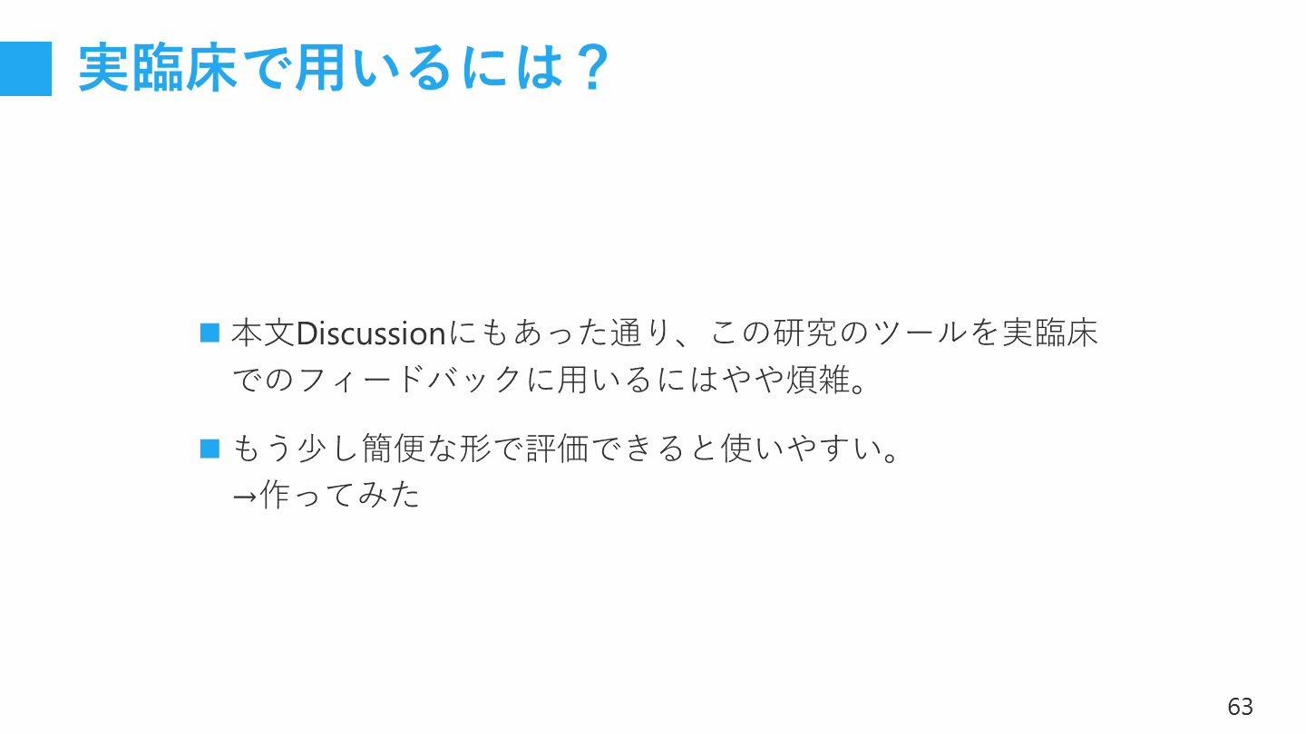 実臨床で用いるには? 本文Discussionにもあった通り、この研究のツールを実臨床でのフィードバックに用いるにはやや煩雑。
