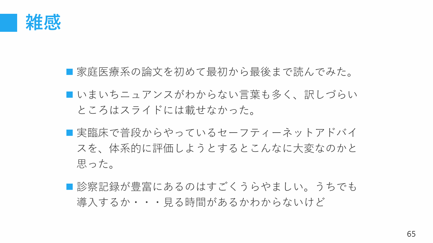 実臨床で普段からやっているセーフティーネットアドバイスを、体系的に評価しようとするとこんなに大変なのかと思った。