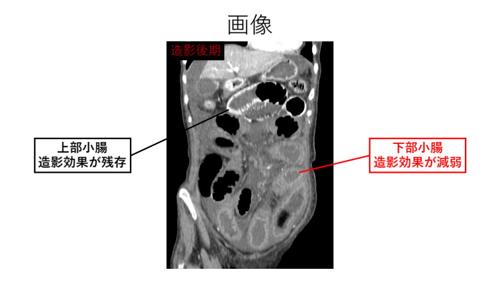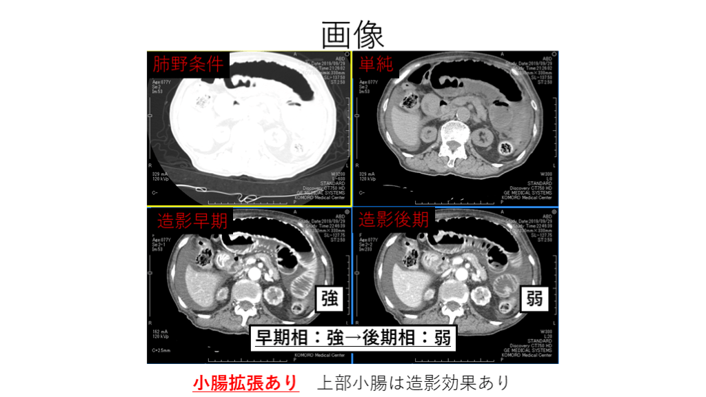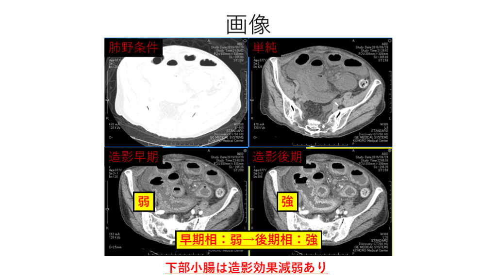 #7. 画像 小腸拡張あり 上部小腸は造影効果あり 肺野条件 造影後期 造影早期 単純 強 弱 早期相:強→後期相:弱