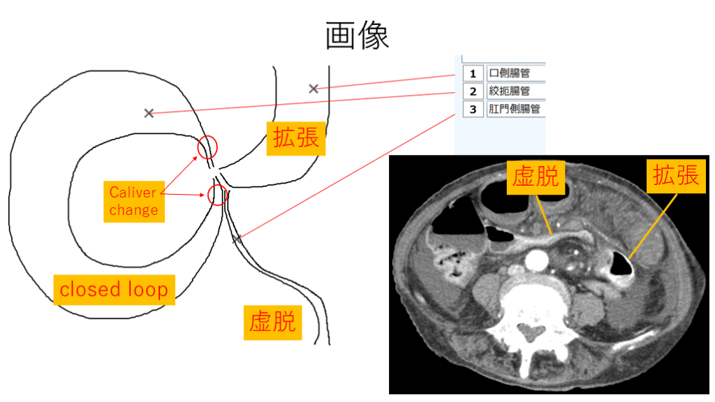 Bowel 腸管 (腸管拡張:小腸3・結腸6・盲腸9cm以上、先細り像の有無)