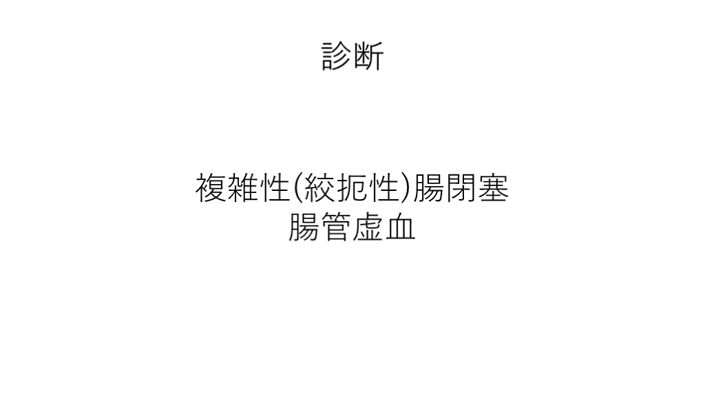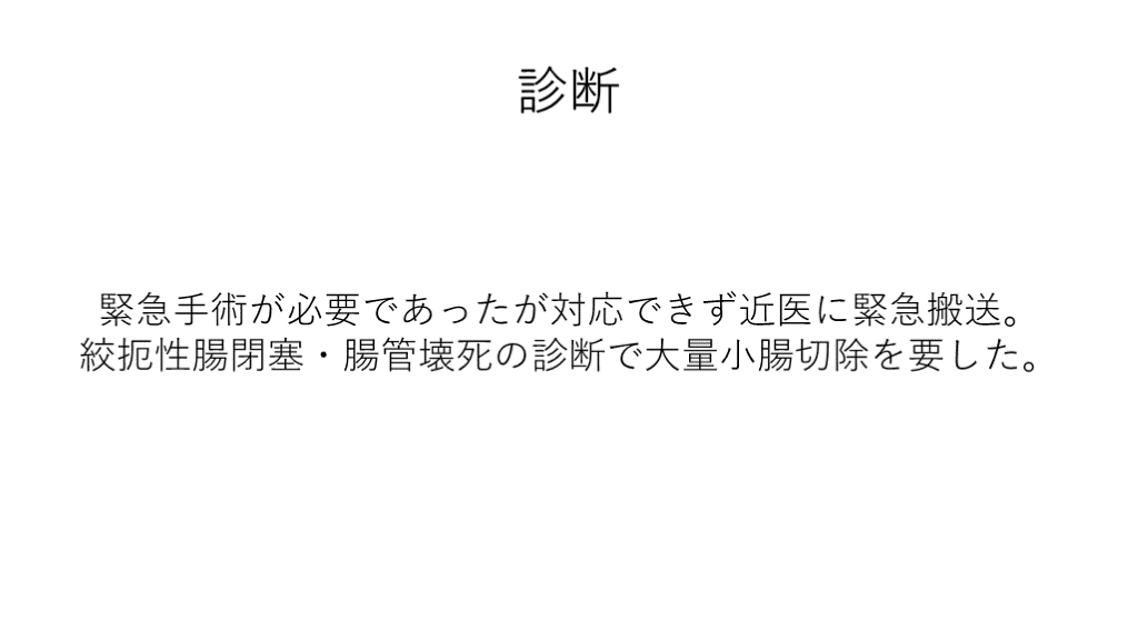 絞扼性腸閉塞・腸管壊死の診断で大量小腸切除を要した。