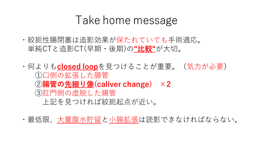 #14. Take home message ・絞扼性腸閉塞は造影効果が保たれていても手術適応。