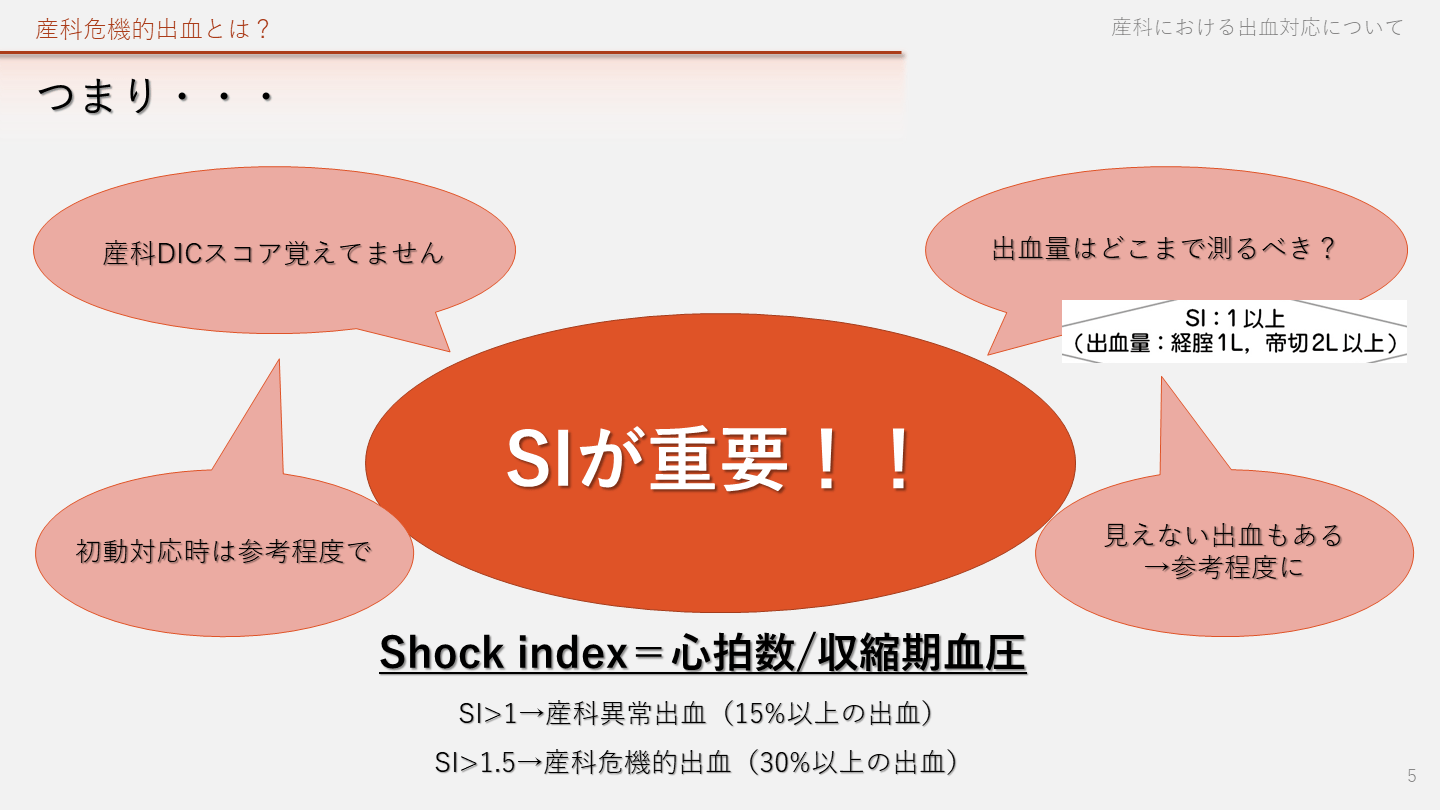 #5. つまり・・・ 産科危機的出血とは? SIが重要!! Shock index=心拍数/収縮期血圧
