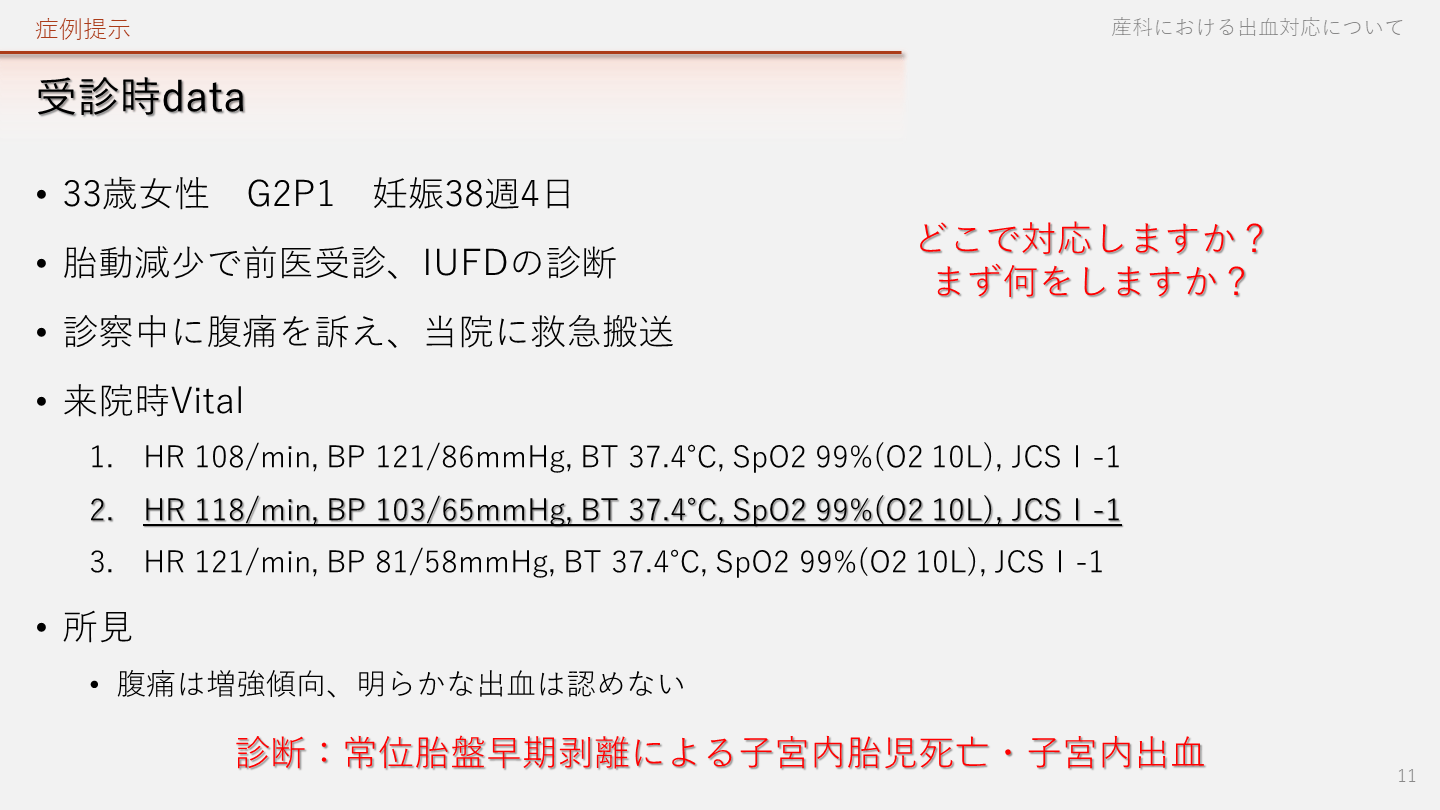 腹痛は増強傾向、明らかな出血は認めない 症例提示 産科における出血対応について 11 診断:常位胎盤早期剥離による子宮内胎児死亡・子宮内出血 どこで対応しますか?