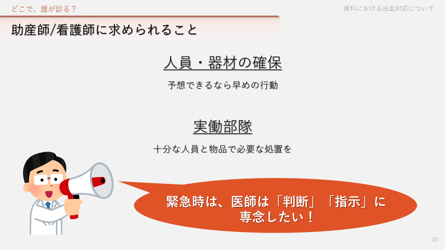 どこで、誰が診る? 産科における出血対応について 15 緊急時は、医師は「判断」「指示」に