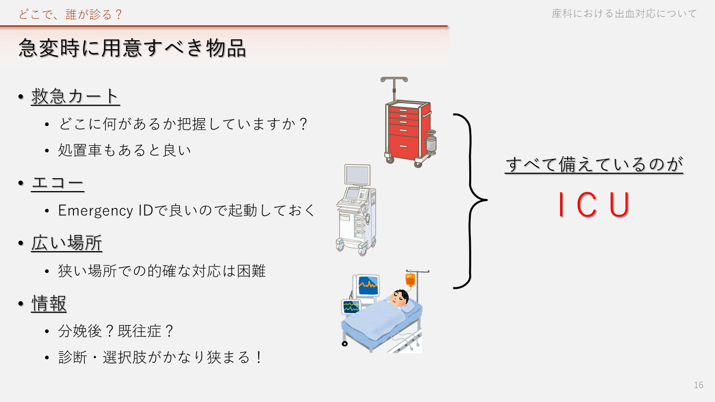 診断・選択肢がかなり狭まる! 産科における出血対応について 16 どこで、誰が診る? すべて備えているのが I C U