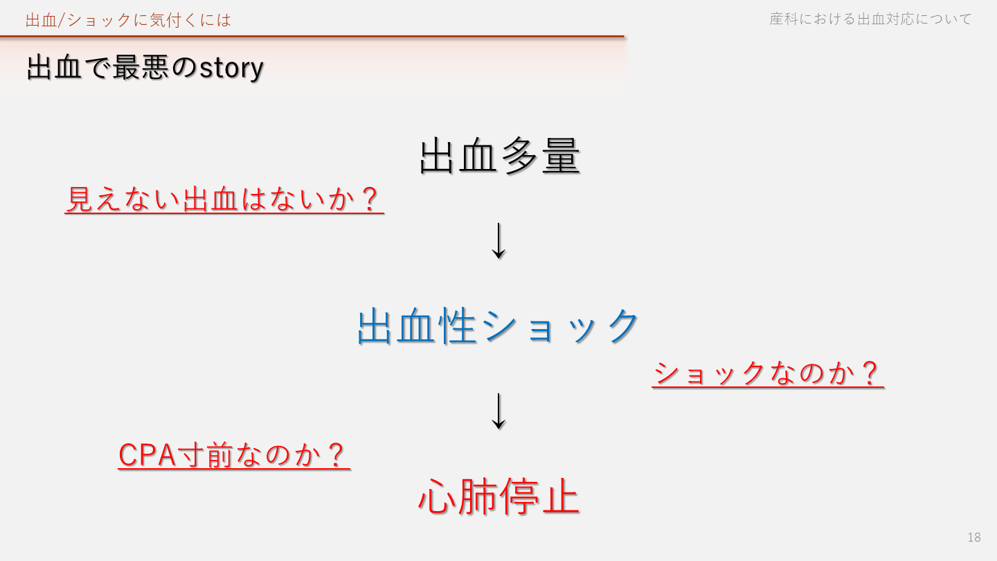 心肺停止 出血/ショックに気付くには 産科における出血対応について 18 見えない出血はないか? CPA寸前なのか? ショックなのか?