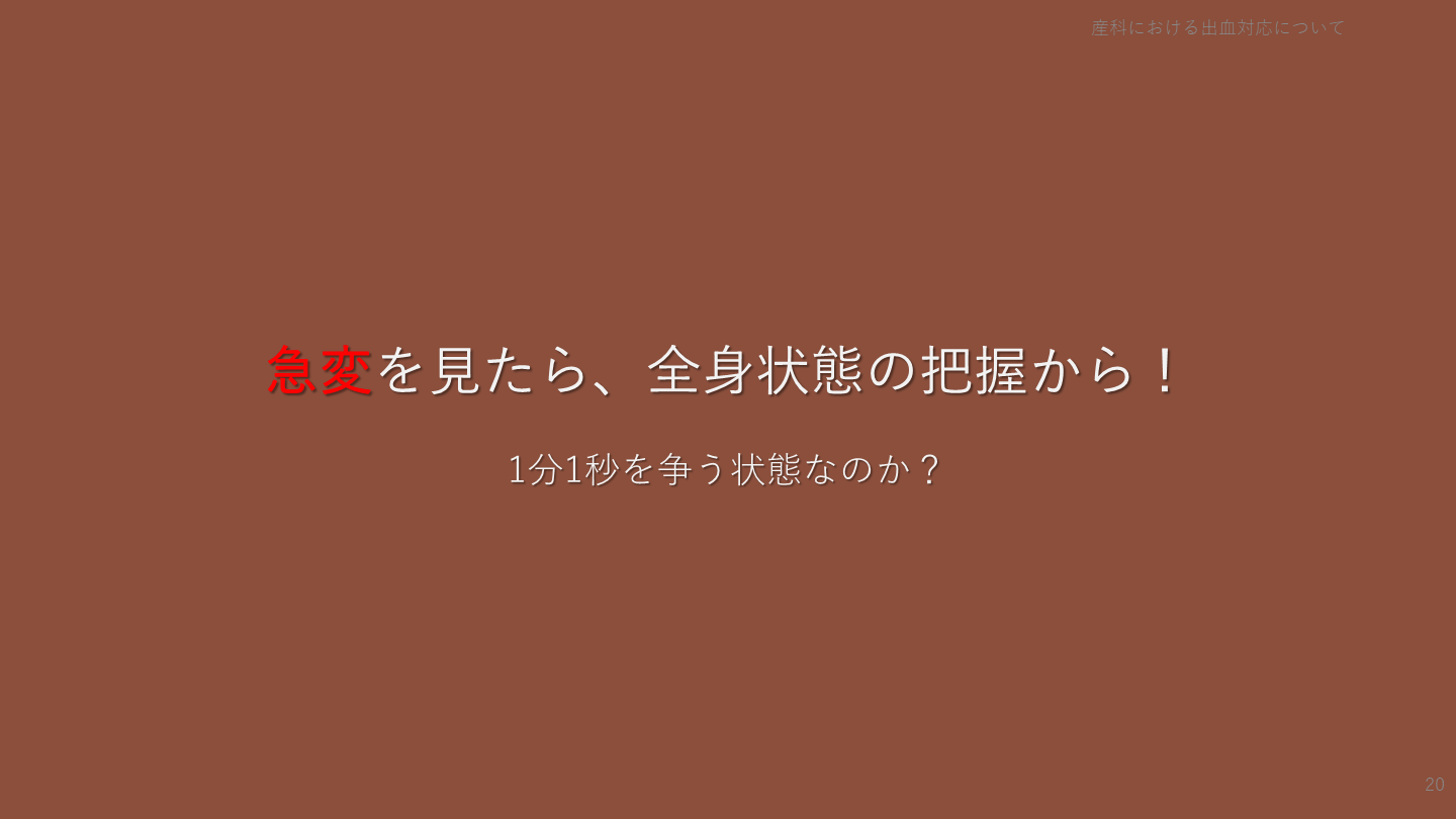 #20. 急変を見たら、全身状態の把握から! 1分1秒を争う状態なのか? 産科における出血対応について 20