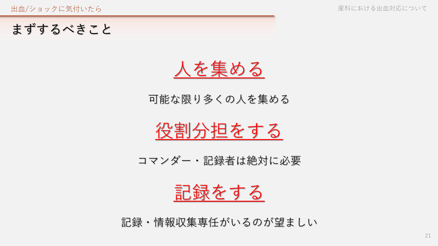 記録・情報収集専任がいるのが望ましい 出血/ショックに気付いたら 産科における出血対応について 21
