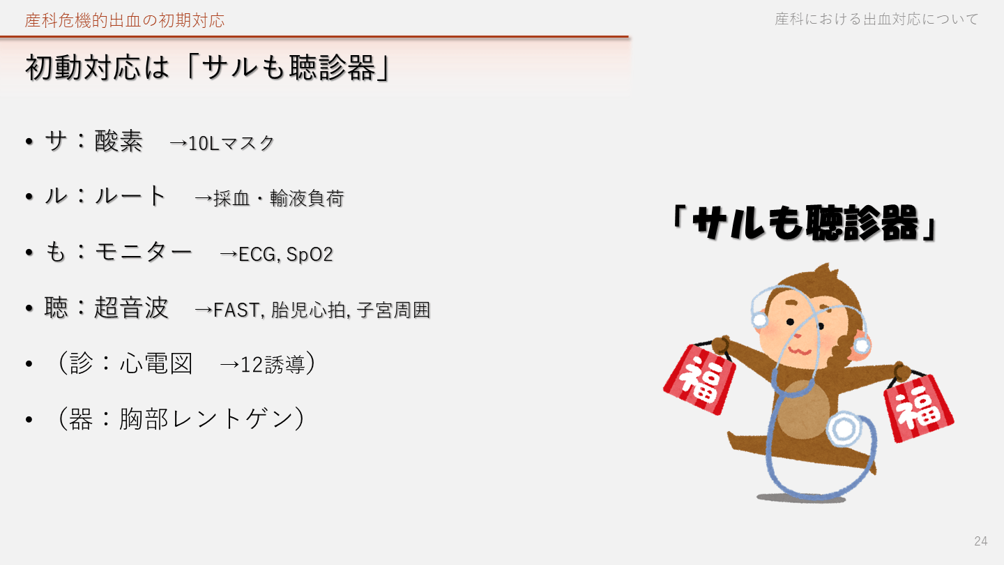 (器:胸部レントゲン) 産科における出血対応について 24 産科危機的出血の初期対応 「サルも聴診器」
