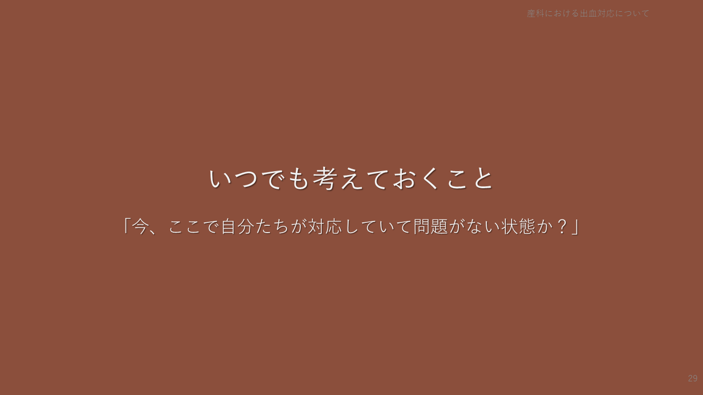#29. いつでも考えておくこと 「今、ここで自分たちが対応していて問題がない状態か?」 産科における出血対応について 29