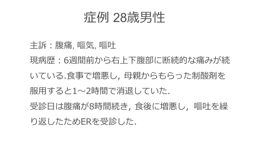 現病歴:6週間前から右上下腹部に断続的な痛みが続いている.食事で増悪し, 母親からもらった制酸剤を服用すると1~2時間で消退していた.