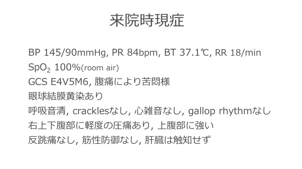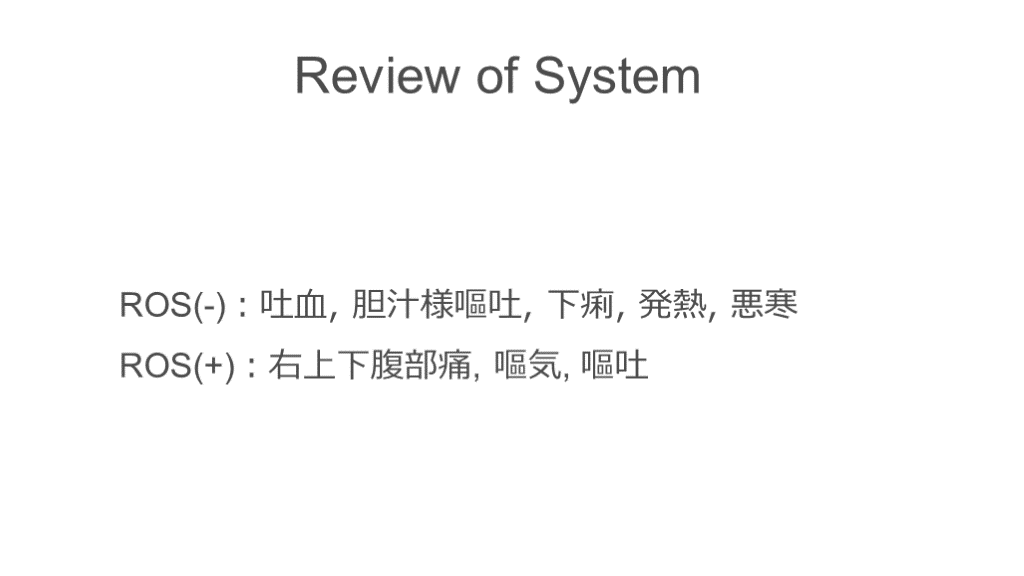 ROS(+):右上下腹部痛, 嘔気, 嘔吐 Review of System