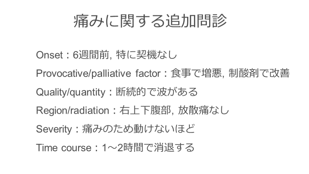 Provocative/palliative factor:食事で増悪, 制酸剤で改善