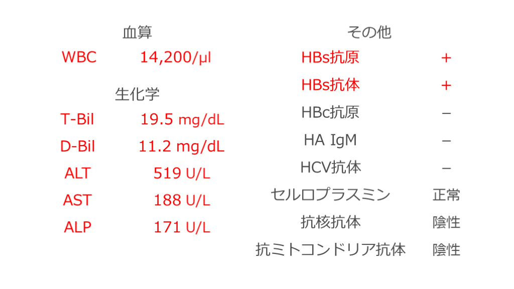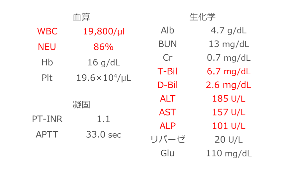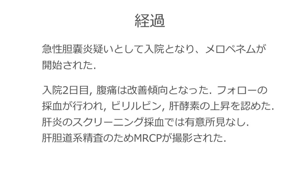 入院2日目, 腹痛は改善傾向となった. フォローの採血が行われ, ビリルビン, 肝酵素の上昇を認めた.