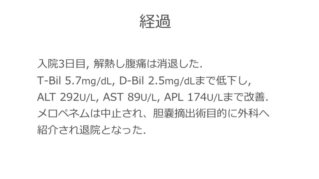 メロペネムは中止され、胆嚢摘出術目的に外科へ紹介され退院となった. 経過