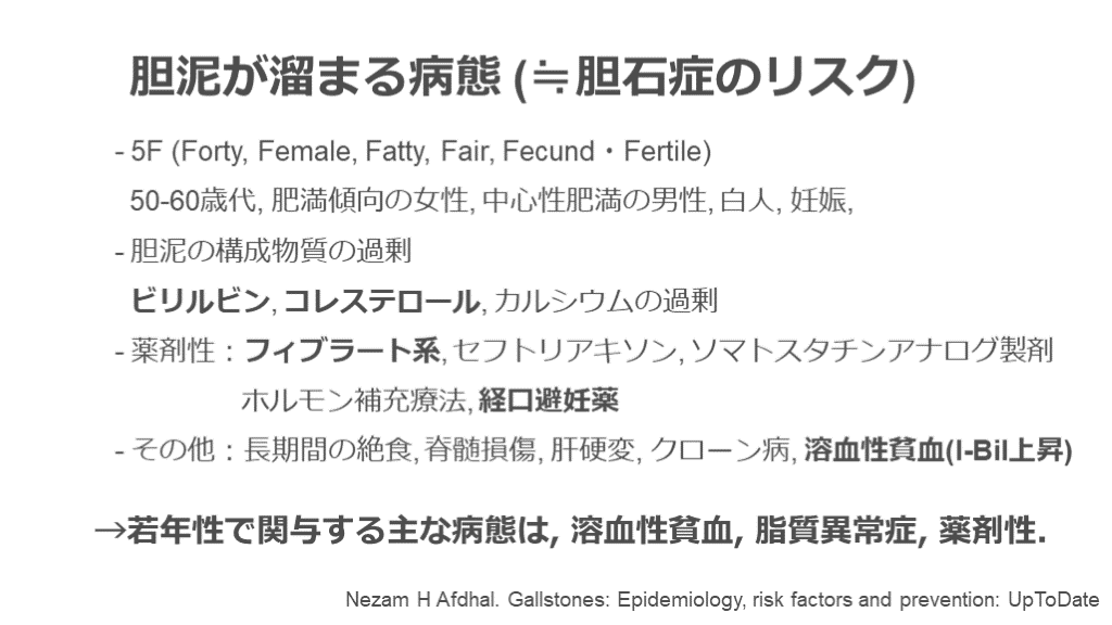 胆泥が溜まる病態 (≒胆石症のリスク) Nezam H Afdhal. Gallstones: Epidemiology, risk factors and prevention: UpToDate →若年性で関与する主な病態は, 溶血性貧血, 脂質異常症, 薬剤性.