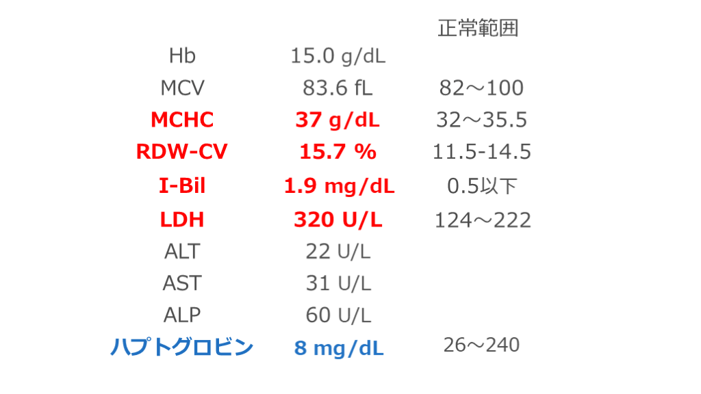 #27. I-Bil上昇, LDH上昇, ハプトグロビンの低下あり.Hbは正常のため, 代償された溶血性貧血が疑われた.