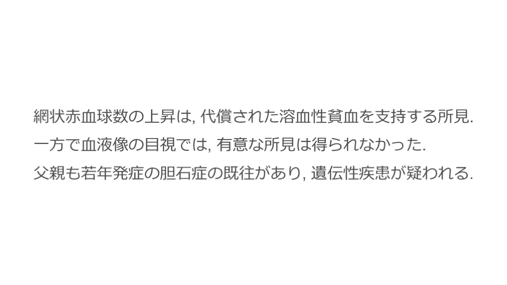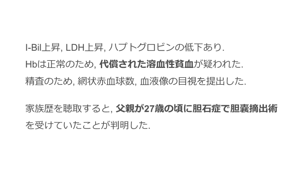 家族歴を聴取すると, 父親が27歳の頃に胆石症で胆嚢摘出術を受けていたことが判明した.