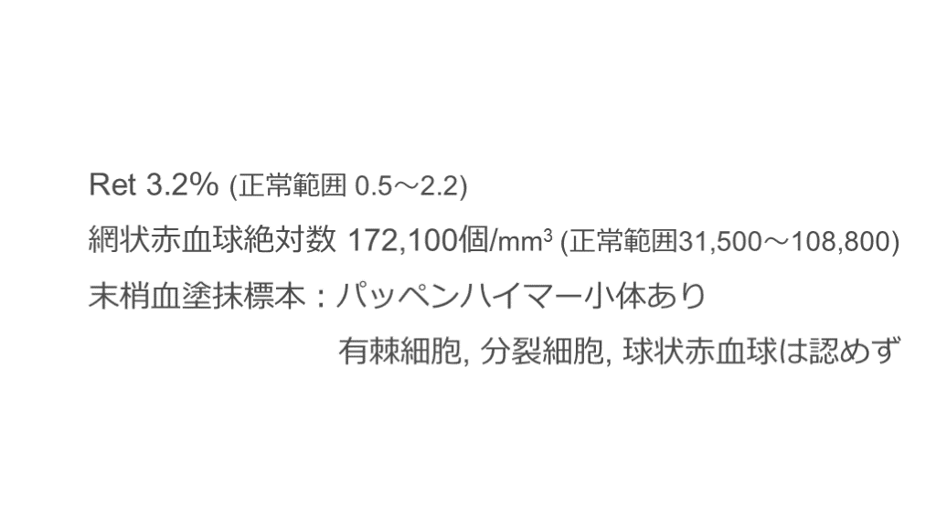 末梢血塗抹標本:パッペンハイマー小体あり 有棘細胞, 分裂細胞, 球状赤血球は認めず