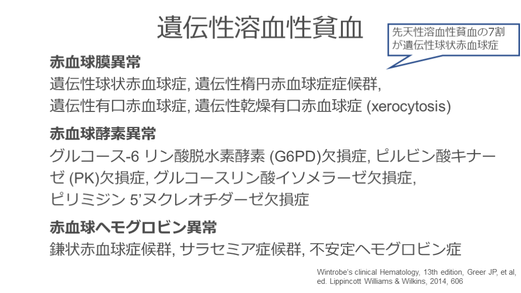 鎌状赤血球症候群, サラセミア症候群, 不安定ヘモグロビン症 遺伝性溶血性貧血 Wintrobe’s clinical Hematology, 13th edition, Greer JP, et al, ed. Lippincott Williams & Wilkins, 2014, 606 先天性溶血性貧血の7割が遺伝性球状赤血球症