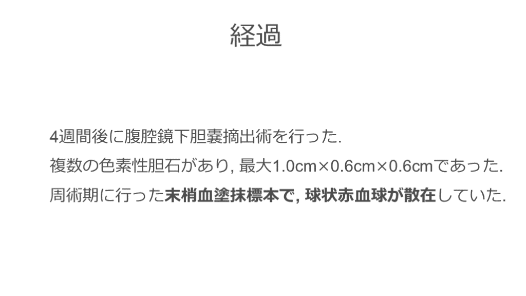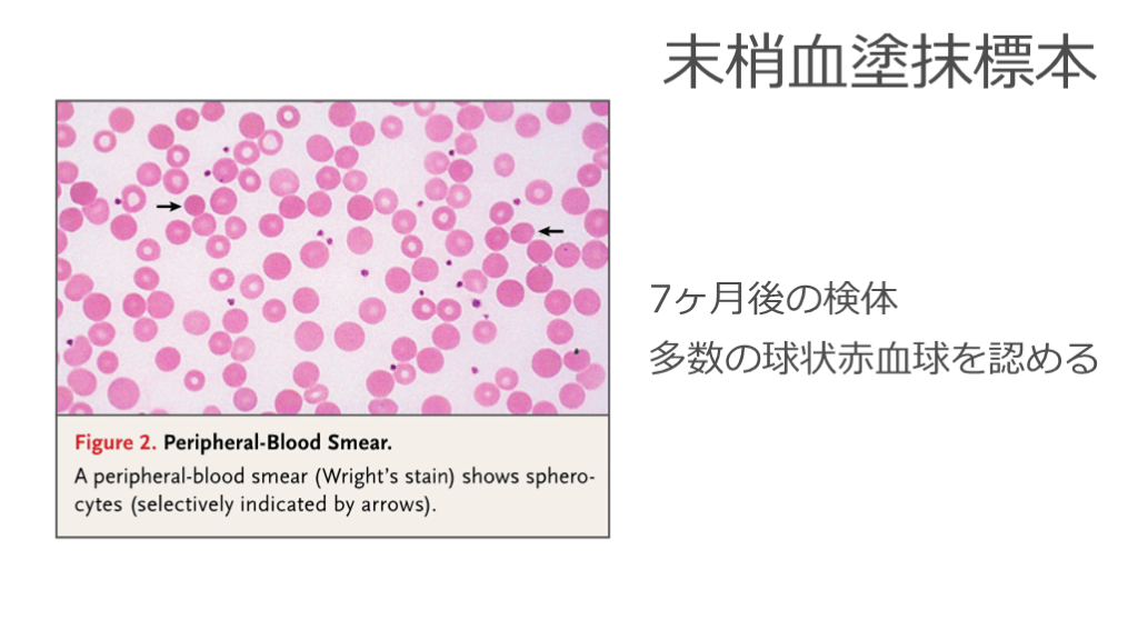 周術期に行った末梢血塗抹標本で, 球状赤血球が散在していた. 経過