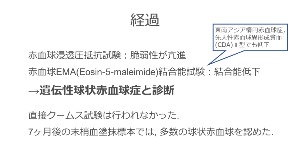 7ヶ月後の末梢血塗抹標本では, 多数の球状赤血球を認めた. 経過 東南アジア楕円赤血球症, 先天性赤血球異形成貧血(CDA)Ⅱ型でも低下