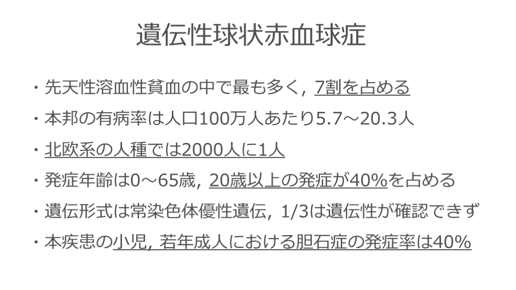 ・本疾患の小児, 若年成人における胆石症の発症率は40% 遺伝性球状赤血球症