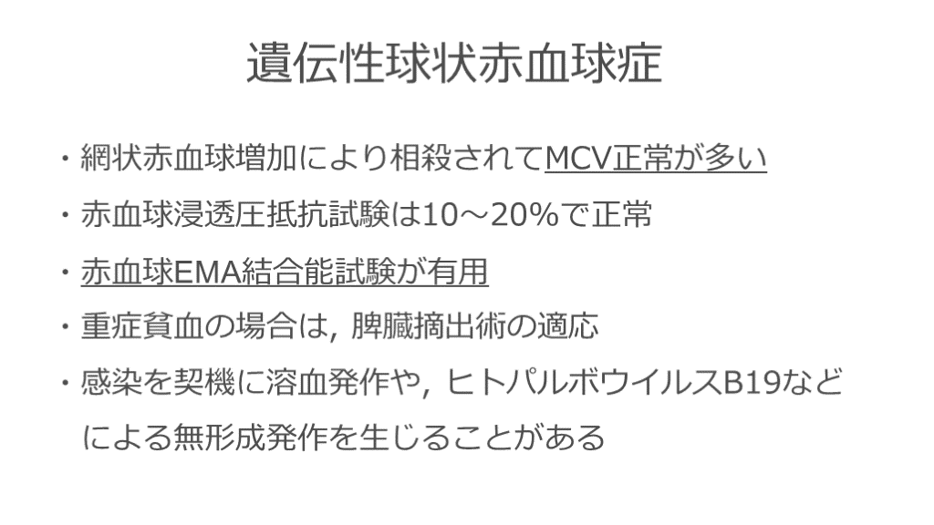 ・感染を契機に溶血発作や, ヒトパルボウイルスB19など による無形成発作を生じることがある 遺伝性球状赤血球症