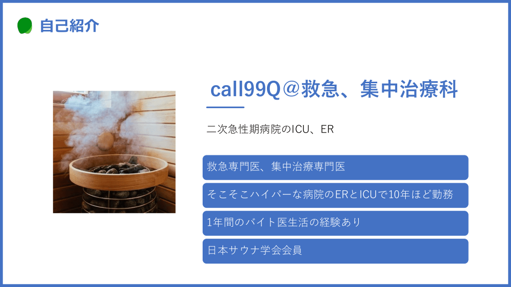 #2. 自己紹介 call99Q@救急、集中治療科 二次急性期病院のICU、ER 救急専門医、集中治療専門医 そこそこハイパーな病院のERとICUで10年ほど勤務 1年間のバイト医生活の経験あり 日本サウナ学会会員
