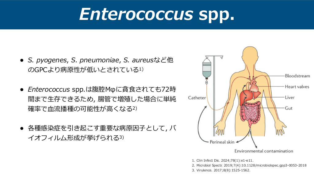 Enterococcus spp. • S. pyogenes, S. pneumoniae, S. aureusなど他 のGPCより病原性が低いとされている1) • Enterococcus spp.は腹腔Mφに貪 されても72時 間まで 存できるため, 腸管で増殖した場合に単純 確率で 流播種の可能性が くなる2) • 各種感染症を引き起こす重要な病原因 イオフィルム形成が挙げられる3) として, バ 子 食 高 血 生 1. Clin Infect Dis. 2024;78(1):e1-e11. 2. Microbiol Spectr. 2019;7(4):10.1128/microbiolspec.gpp3-0053-2018 3. Virulence. 2017;8(8):1525-1562. #14.