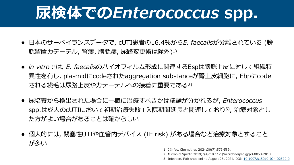 • 尿培養から検出された場合に 概に治療すべきかは議論が分かれるが, Enterococcus spp.は成 のcUTIにおいて初期治療失敗+ 院期間延 と関連しており3), 治療対象とし た がよい場合があることは確からしい • 個 的には, 閉塞性UTIや が多い 管内デバイス (IE risk) がある場合など治療対象とすること 皮 皮 長 1. J Infect Chemother. 2024;30(7):579-589. 2. Microbiol Spectr. 2019;7(4):10.1128/microbiolspec.gpp3-0053-2018 3. Infection. Published online August 28, 2024. DOI: 10.1007/s15010-024-02372-0 入 一 in vitroでは, E. faecalisのバイオフィルム形成に関連するEspは膀胱上 に対して組織特 異性を有し, plasmidにcodeされたaggregation substanceが腎上 細胞に, Ebpにcode される繊 は尿路上 やカテーテルへの接着に重要である2) 血 • 皮 本のサーベイランスデータで, cUTI患者の16.4%からE. faecalisが分離されている (膀 胱留置カテーテル, 腎瘻, 膀胱瘻, 尿路変更術は除外)1) 毛 • 人 人 方 日 尿検体でのEnterococcus spp. #16.