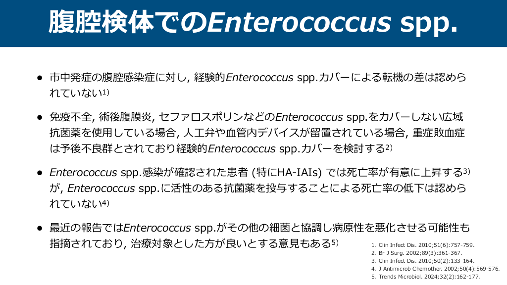 腹腔検体でのEnterococcus spp. • 市中発症の腹腔感染症に対し, 経験的Enterococcus spp.カバーによる転機の差は認めら れていない1) • 免疫不全, 術後腹膜炎, セファロスポリンなどのEnterococcus spp.をカバーしない広域 抗菌薬を使 している場合, 弁や 管内デバイスが留置されている場合, 重症敗 症 は予後不良群とされており経験的Enterococcus spp.カバーを検討する2) • Enterococcus spp.感染が確認された患者 (特にHA-IAIs) では死亡率が有意に上昇する3) が, Enterococcus spp.に活性のある抗菌薬を投与することによる死亡率の低下は認めら れていない4) • 最近の報告ではEnterococcus spp.がその他の細菌と協調し病原性を悪化させる可能性も 1. Clin Infect Dis. 2010;51(6):757-759. 指摘されており, 治療対象とした が良いとする意 もある5) 2. Br J Surg. 2002;89(3):361-367. 3. Clin Infect Dis. 2010;50(2):133-164. 血 見 血 方 工 人 用 4. J Antimicrob Chemother. 2002;50(4):569-576. 5. Trends Microbiol. 2024;32(2):162-177. Enterococcal Bacteremiaの疫学と治療 #17.